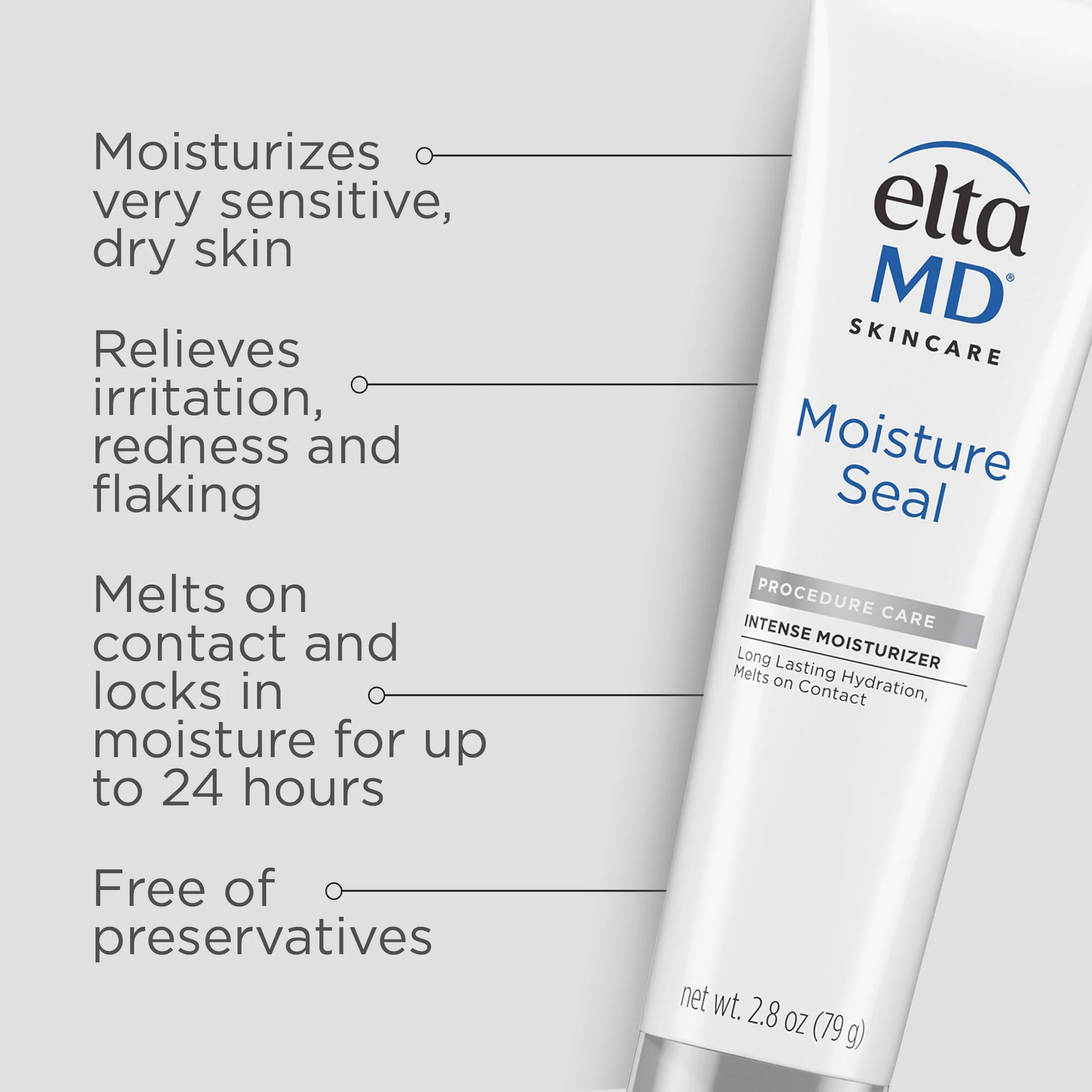 EltaMD Moisture Seal melts on contact and locks in moisture for up to 24 hours. It spreads easily, forming a protective layer over the skin. This intense occlusive moisturizer helps soothe dry, flaky, intact skin after procedures. This waterless, preservative-free formulation is designed for delicate skin resulting from cosmetic or medical treatments. (net wt 2.8 oz/79 g) SIZE: 2.8 OZ TUBE